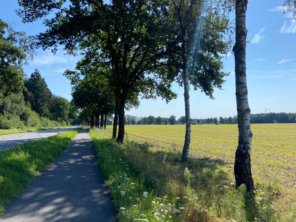 Heute aber fahre ich mit Wolf zwei Stunden ins Wendland hinein, auf den Hof meines besten Freundes. Ich komme nur langsam voran, weil ich Federn aufsammeln muss, weil drei Kraniche über meinen Kopf entlangfliegen, weil es 30 Grad sind und ich aus dem Wald nicht raus möchte. Auf dem Hof aber werde ich ruhiger. Hier geht alles seinen gewohnten Gang. Hier herrscht nirgendwo Ordnung, immer nur Chaos. Das fühlt sich gut an, weil ich da gerade so reinpasse und weil manchmal auch mal Chaos sein darf. Es muss nicht alles aufgeräumt sein, es muss nicht alles nach Plan laufen. Jetzt fünf Tage mal nichts machen, außer Rad fahren, nachfühlen und genießen. Mal alles so lassen, wie es gerade ist. Und dann entscheiden – wenn mir danach ist.