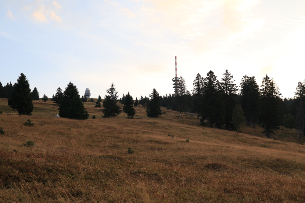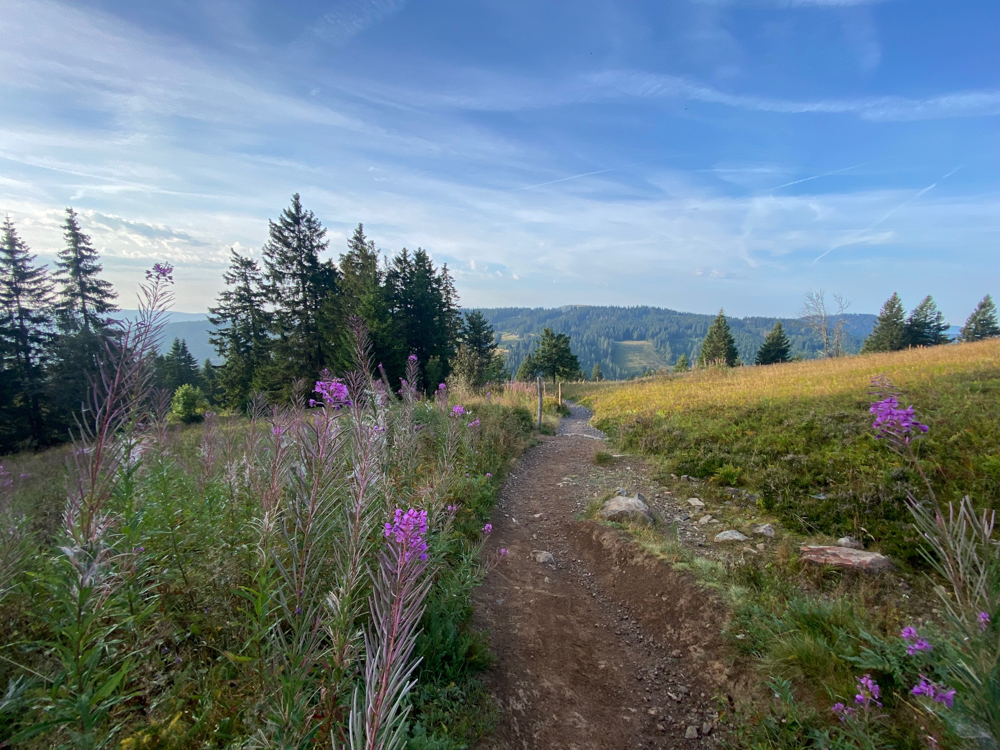 Am nächsten Morgen bin ich früh los zum Feldberg. Erstmal habe ich keinen Parkplatz gefunden – die Wanderung sollte am Haus der Natur starten – dann ging es doch von einem Wanderparkplatz, den ich durch Zufall auf Maps gefunden hatte, los. Der Feldbergsteig ist ca. 12 km lang und führt über den Gipfel sowie an dem Feldsee vorbei. Auf meinen ersten Metern auf den Gipfel hinauf habe ich einen Niederländer getroffen, der mit dem Rad von Berlin in 16 Tagen hier runter gefahren ist. Auch eine nette Aufgabe.