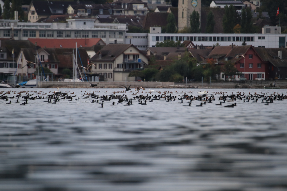 Im Schilf lange Hälse. Gereckt, um zu schauen, was da kommt. Warnrufe. Ein tosender Flügelschlag einer Masse. Das vielleicht schönste Geräusch des Herbstes. Blesshühner, die starten. Haubentaucher, die verschwinden. Wildgänse, die landen. Zwergtaucher so nah, wie man sie ohne Kajak nie zu Gesicht bekommt. Und ich irgendwo mittendrin.