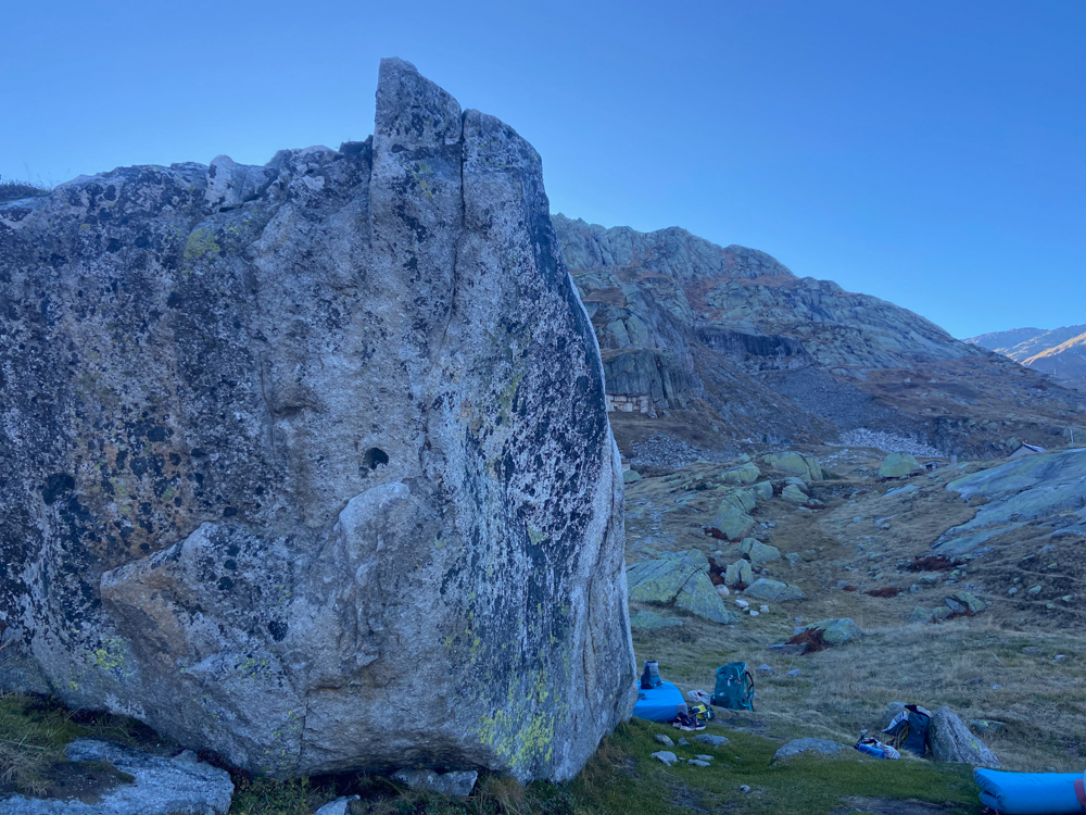 Am Samstag ist die Energie nach 11 Stunden Schlaf zurück. Ich bin heiß, ich will an den Fels. Aber die Sonne ist noch nicht lange da, also muss ich mich gedulden. Aber irgendwann geht’s los. Ein bisschen tüfteln, Minuspunkte sammeln, dann wieder Pluspunkte. Positive Rückmeldungen und Beta-Tipps erhalten. Während den Pausen liege ich auf dem Rücken im Gras, genieße die Stille. Ganz manchmal lehne ich mich auch an, hole mir Windschutz oder Wärme ab. Und dann bin ich elektrisiert, die Linie geht trotzdem nicht auf.