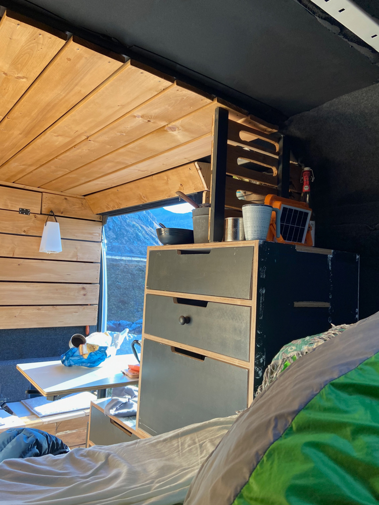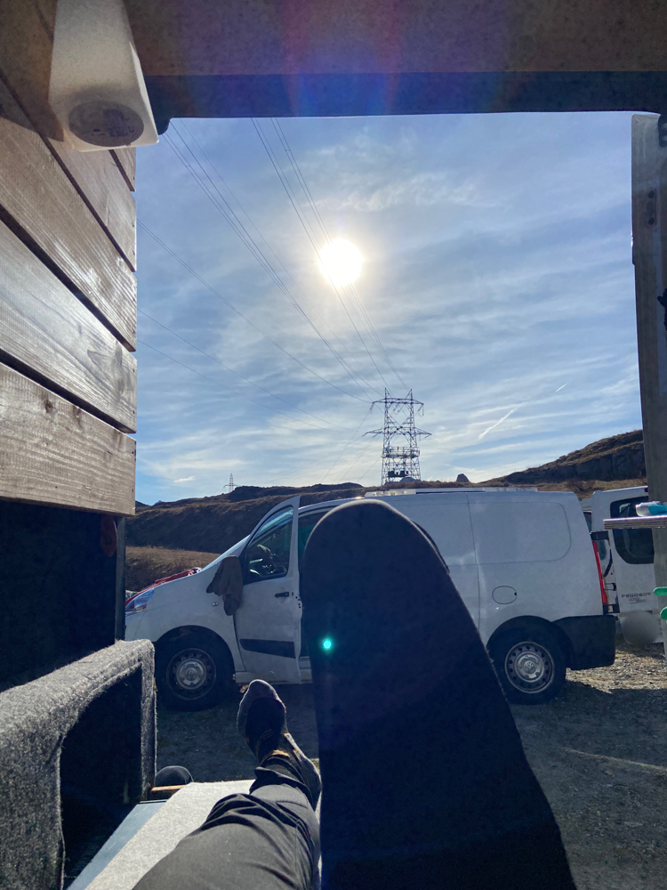 Die erste Nacht ist kalt und ungewohnt und ich komme kaum in den Schlaf. In einem fremden Bus liegend, mit einer Person neben mir, und dann das monotone Geräusch des Windrads. Am nächsten Morgen brauche ich lange, um in den Quark zu kommen. Mit Tee und Kaffee sitzen wir auf den Crash Pads und halten die Gesichter in die Sonne, während M Pfannkuchen macht. Besser könnte der Tag nicht starten.