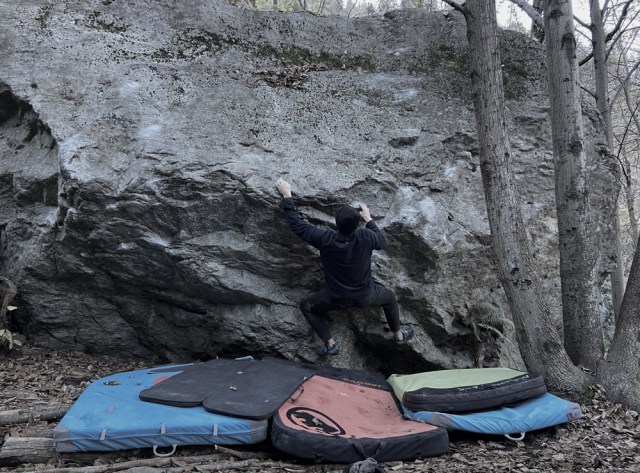 Zwei Komma Fünf Tage Steine festhalten, Haut verlieren, Felsen umarmen, dumme Sprüche gedrückt bekommen, Schürfwunden ziehen, Geruch von nassem Moos und Laub einatmen. Esskastanien piksen beim Laufen durch die Schuhe. Ziegenglocken läuten in der Ferne und die dazugehörigen Ziegen sind neugierig. Sie finden uns, durchstöbern unsere Taschen, rangeln mit M, stehen neben den Jungs auf dem Crash Pad, als wollten sie auch direkt an den Felsen kraxeln – und sie könnten es wahrscheinlich sogar besser als wir.