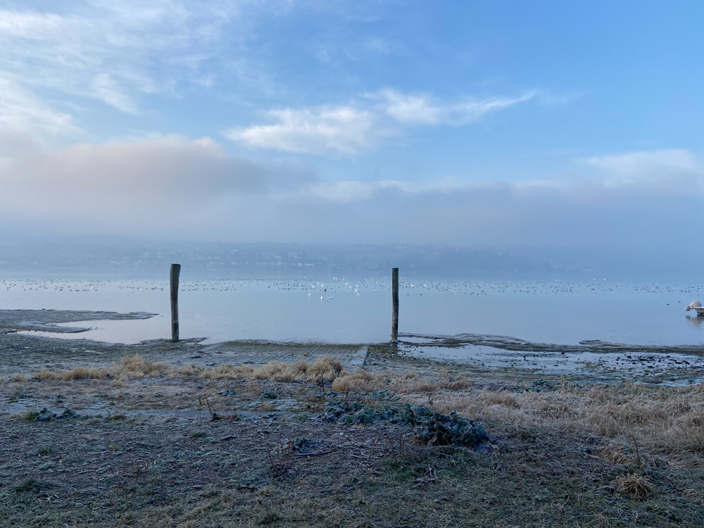 Nach einem kurzen Fahrradweg lande ich dann auf dem Reichenauer Damm. Hier ist in der Lagune gar nichts los. Macht nichts. Ein paar Meter weiter höre ich plötzlich mir sehr bekannte Töne. Die letzten Wochen habe ich mich gefragt, warum ich sie diesen Winter noch nicht zu hören bekommen habe. Jetzt sind sie da. Die Singschwäne liefern sich ein Konzert, wobei es sich schon eher so anhört, als müssten sie noch etwas üben. Ich lieb’s. Sehe sie zwar nur aus weiter Entfernung, bleibe aber trotzdem noch etwas stehen und höre mir an, wie aufgeregt sie durcheinander schwätzen.