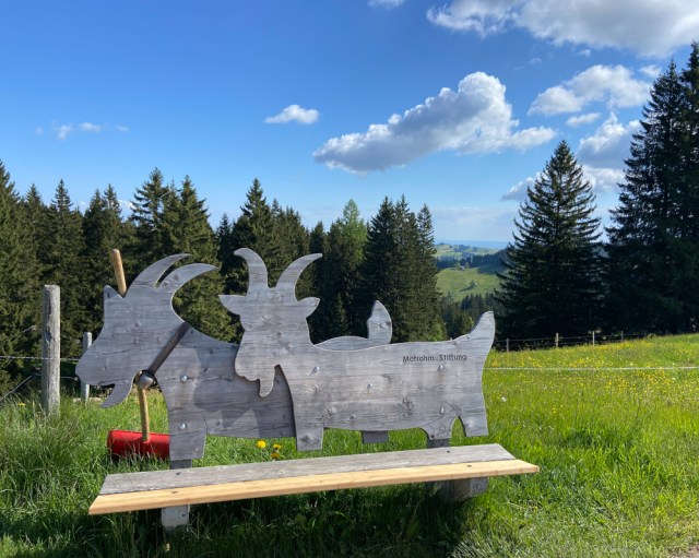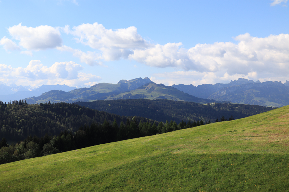 Kurz vorm Gipfel gibt’s eine kurze Trinkpause auf der Gais-Bank. Für einen ganz kleinen Moment entdecke ich den Bodensee zwischen den Bäumen, als ich weiter hinauf laufe. Oben angekommen liegt mir ein schönes Bergpanorama auf Augenhöhe. Da ist der Hohe Kasten und da ist der Säntis. Da sind die Kreuzberge, die Altenalptürme und vielleicht auch die sieben Churfürsten. Sicher bin ich mir da nicht. Wie viele Leute wohl heute auf den Berggipfeln unterwegs sind. Sich die Bäuche vollschlagen und in die Weite schauen.