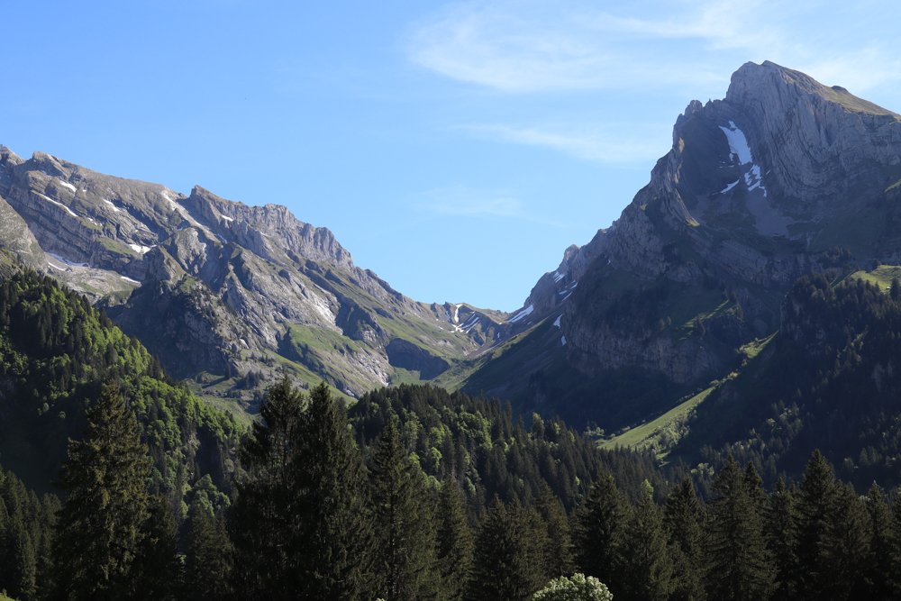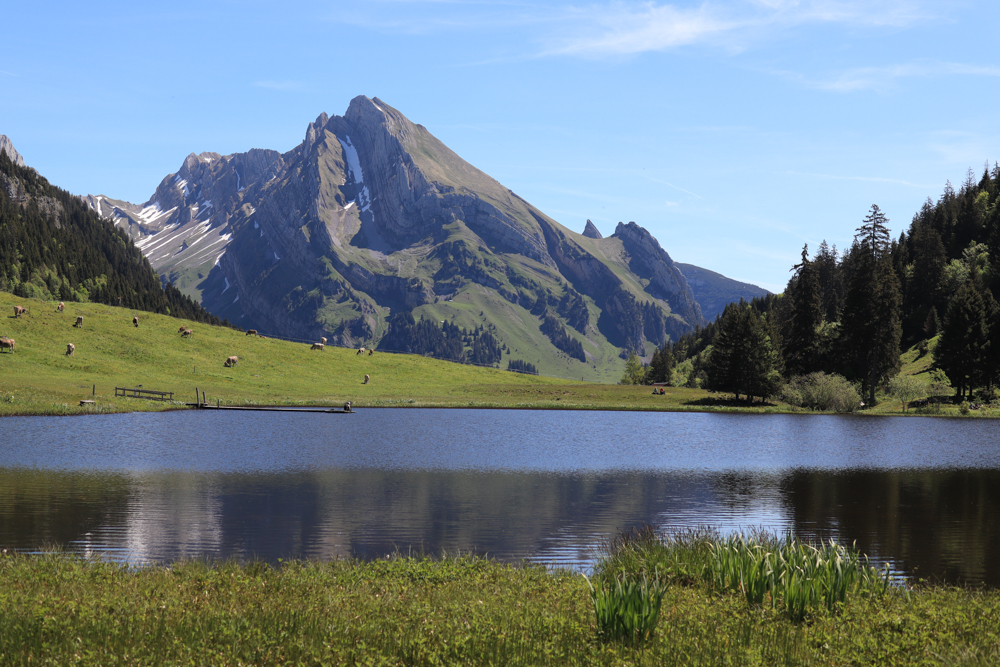 Von Laui aus gibt es eine gemütliche Wanderung zum See. Da sieht man erstmal den Säntis (ist gar nicht so hoch) und den Altmann. Und eigentlich will ich jetzt direkt hinauf. Eigentlich will ich auch jetzt direkt in den See springen, aber er ist eisig kalt. Ich beobachte bewundernd einen Radfahrer, der sich für 10 Sekunden im See abkühlt.