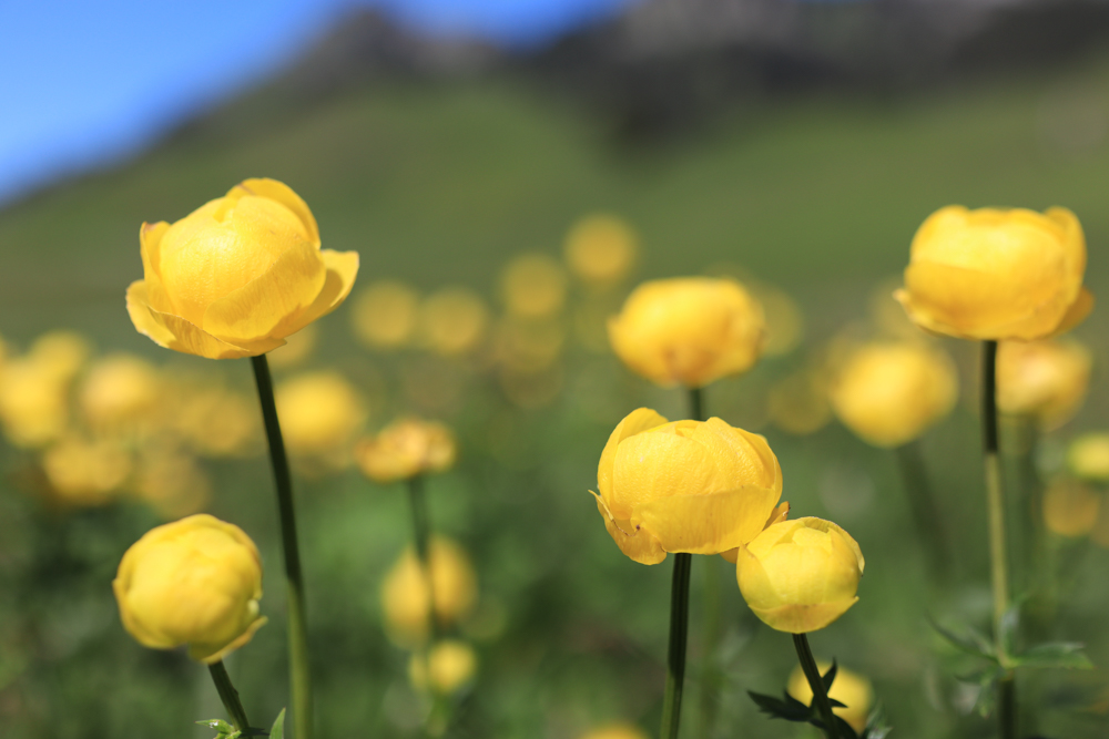 Was ich auch bewundere: Trollblümchen, Fingerwurz und Knöterich. Ich weiß gar nicht, wohin ich zuerst schauen soll. Auf all die Blumen, auf die kleinen Kaulquappen (wie lange habe ich keine Kaulquappen mehr gesehen!), auf die Berge, die Kühe, den strahlenden Himmel? Deswegen huscht mein Blick von einem zum anderen, bis ich mich zusammenreiße und Achtsamkeit walten lasse. Es ist doch Zeit. Nur weil die Parkuhr in meiner EasyPark-App runterzählt, heißt das doch nicht, dass ich mich beeilen muss.