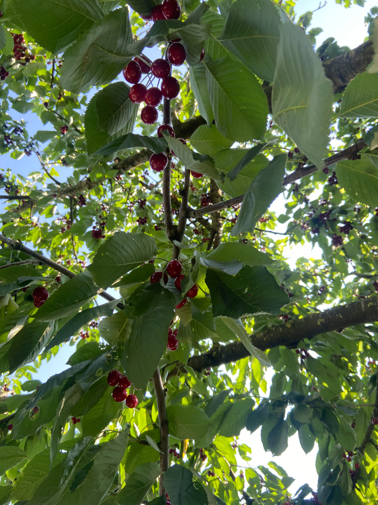 Mit nassen Klamotten laufe ich zu meiner ehemaligen Vermieterin. Barfuß, weil sich das so gehört. Klettre auf die Leiter hinauf, hinein in den Baum. Da hängen sie die roten Kirschen. Eine in den Mund, eine in die Schale. Die Amsel lauert bereits. Mit voller Schüssel und nackten Füßen laufe ich weiter nach Hause.