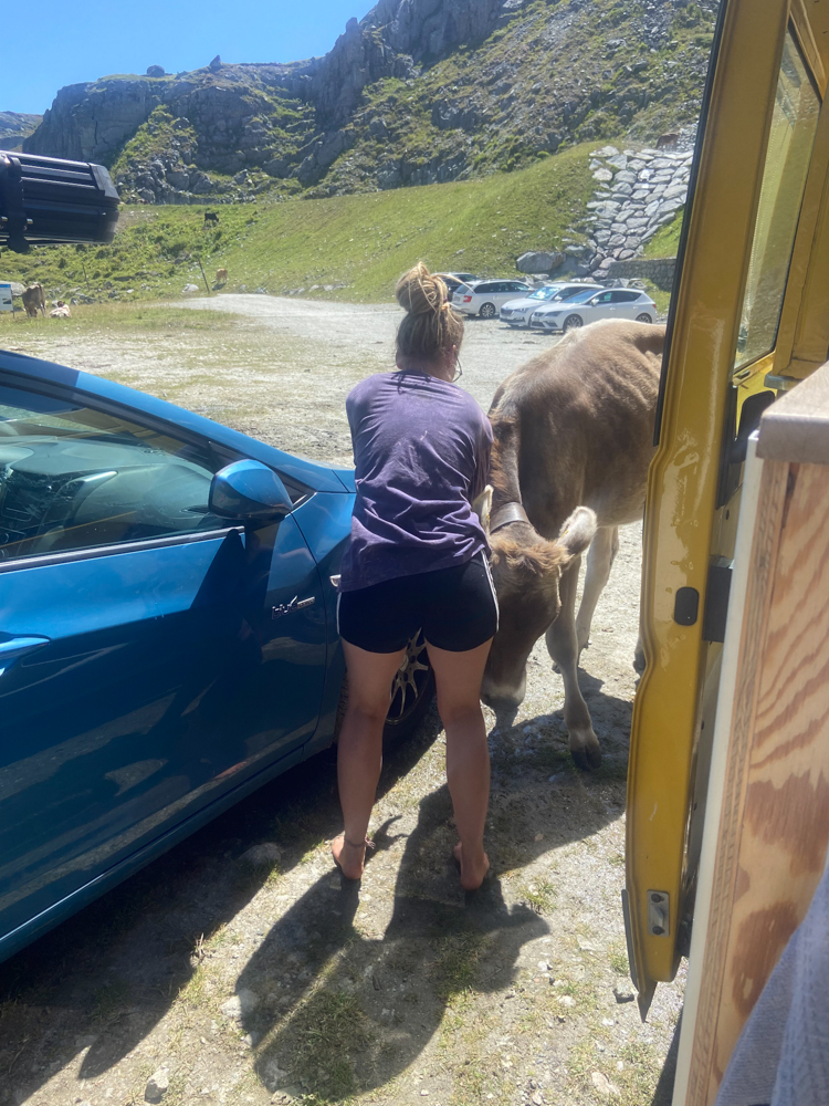 Beide sitzen entspannt vor und im Camper. Es hat sich nichts getan, seitdem ich losgelaufen bin. Wir quatschen noch ein bisschen und rangeln die Kühe weg, die sich leider an unseren Autos schubbern. Kuh-Kratzer machen sich bestimmt gut, wenn man sein Auto verkaufen will. Bin aber selber Schuld. Als Y wieder zu uns stößt, beschließen wir wieder zu fahren. Der Rest des Invalidenlagers bleibt noch auf dem Götti zurück und lauscht den Kuhglocken.