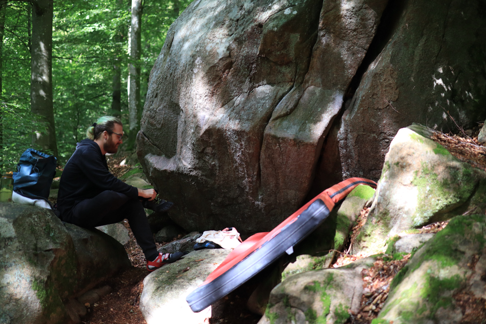 Am ersten Abend wurde rangiert, denn wir waren viel zu spät und mussten noch eine Lücke für uns finden. Am Ufer verteilt standen schon einige andere Camper. Am nächsten Morgen, nach dem Frühstück, schnallte ich mir das Crash Pad auf den Rücken und die große Blöckesuche begann. Irgendwie hatten die Schweden hier nichts an Topos eingetragen und ich irrte durch die Gegend. Nick folgte. Außerdem waren die Boulder alle winzig. Und der Fels nass vom Regen in der Nacht. Einige verzweifelte Gos und ich war bedient. Aber immerhin war der Wald schön.