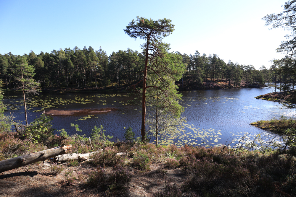 Wir frühstückten Porridge, packten die Sachen und liefen los zu unserer Wanderung. 8,8 km durch den Nationalpark. Die Heide blühte. Die Blaubeeren wuchsen überall am Wegesrand. Dickes Moos und Flechten bedeckten den Boden. Die Kiefern alle krumm und schief. Der See glitzerte einladend im Sonnenlicht, nur der Wind hielt mich ab vom Baden.