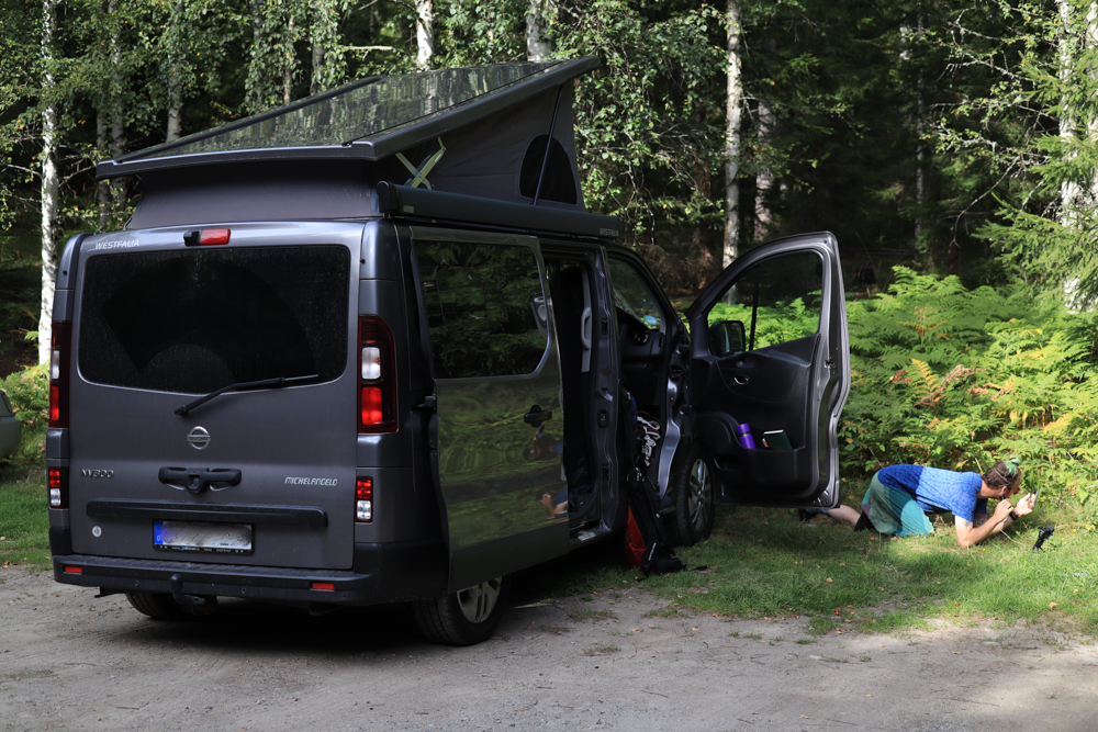 Unser Stellplatz für die Nacht zeigte sich ähnlich unspektakulär. Ein kleiner Parkplatz, ca. 50 Meter vom Badeplatz entfernt. Hier standen bisher nur einheimische Tagesgäste. Unten am kleinen Strand hingegen standen sie dann dicht an dicht mit ihren Campern. Uns war’s zu viel, also blieben wir oben stehen. Außerdem war der Zufahrtsweg mit einem Stein ausgestattet, wo der Camper vorher schon einmal schön aufgesetzt hatte. Der restliche Tagesablauf blieb gleich: Abendessen, abwaschen, ab ins Bett. Die Einflugschneise von Oslo war allerdings etwas laut.