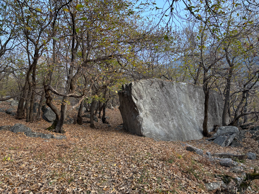 Meinen Verarbeitungsprozess setze ich gleich mit Konfrontation fort. Ich parke umständlich aus der Lücke aus und fahre doch nach Chironico hoch. Auf den Parkplatz wo die bekannte Crew steht, fahre ich allerdings nicht. Mein Morgenspaziergang durch den Kastanienwald führt mich vorbei an all die bekannten Boulder. Von denen ich bisher nichts wirklich gemacht habe, außer sie mal angefasst. Wütend trete ich Esskastanien weg. Hab mir vor zwei Wochen die Finger piksig gestochen und nicht eine Maroni bekommen, weil die dann alle bei M im Bus geblieben sind. Dann entscheide ich nach Hause zu fahren. Nächstes Wochenende ist für’s Bouldern ja hoffentlich auch noch Zeit. Die Leute sind eh hier. Oder da, wo ich sie treffen will.