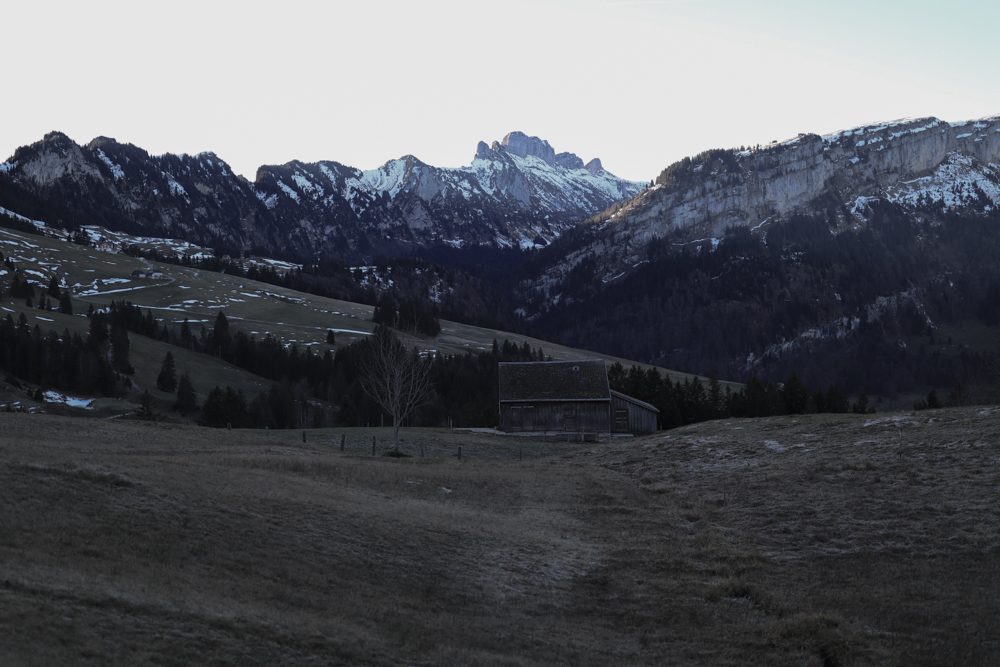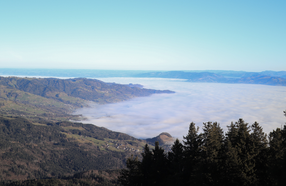 Vor einem Monat war ich das letzte Mal wandern und vor zwei Monaten alleine. Es wurde also mal wieder Zeit. Nach einer Nacht, in der ich mir das Bett mit einer Katze geteilt hatte, war ich etwas müde am frühen Morgen. Wie kann eine so kleine Katze so viel Platz einnehmen? Ich fuhr aus Konstanz raus, als es gerade zu dämmern begann. Dicker Nebel lag auf den Straßen. Kurz befürchtete ich, dass ich den falschen Tag ausgewählt hatte. Selbst im Schweizer Radio war der Nebel Thema. Aber Richtung Appenzellerland lichtete er sich ganz plötzlich und die Sonne erschien vorsichtig aber sicher hinter den Bergen.