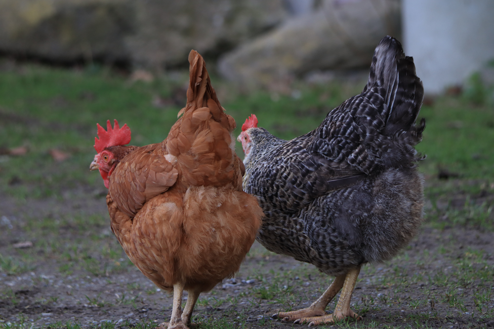 Die Hühnis sind glücklich. Der Hahn passt auf. Fotos machen geht nur unter Aufsicht. Und dann wird laut krakelt. Ab und zu kommen Spaziergänger:innen vorbei. Und der Mond geht auf, er geht unter. Die Sonne geht auf, sie geht unter.