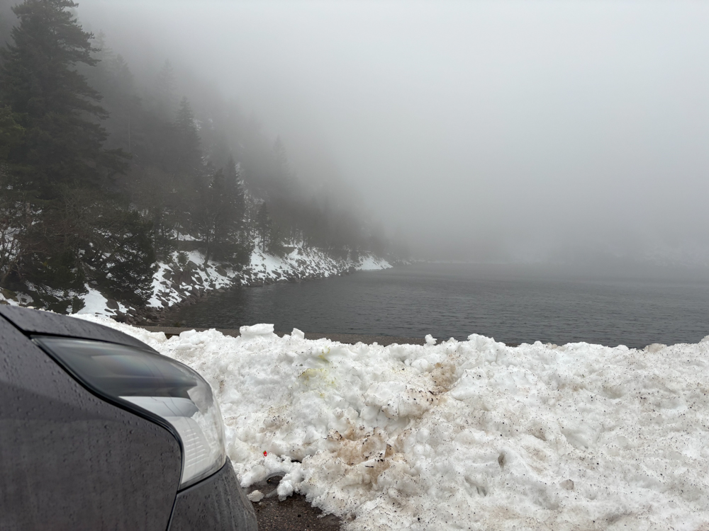 In der Nacht hatte es gestürmt und der Sturm war immer noch nicht weg. Am nächste Morgen nieselte es ein wenig und der See zeigte sich plötzlich im Nebel. Nach einem Tee und Frühstück, Zähne putzen und aufräumen, war ich immer noch nicht schlauer. Eigentlich wäre ich gerne in den Vogesen wandern gegangen, aber die Wanderungen, die ich mir rausgesucht hatte, beinhalteten schwere Abschnitte, die man nicht bei Nässe gehen sollte. Alleine traute ich mir das also nicht zu. Es war die richtige Entscheidung. Ich fuhr noch bis zum Col de la Schlucht, nur um da festzustellen, dass die Parkplätze eine Höhenbegrenzung hatten.
