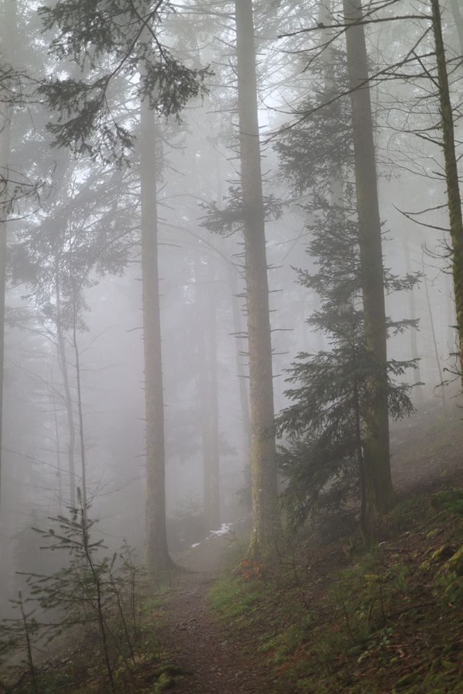 Buchfinken singen ihre Regenlieder. Moos strahlt grün aus dem Weißgrau. Weich sieht es aus. Kuschelig. Streiche sachte drüber. Steige bergauf, bergan. Hinauf zur Aussicht. Hinauf zum Hochblauen. Weiß, es wird keine Aussicht geben. Aber ich laufe trotzdem gerne. Schärfe meine Sinne im Nebel.