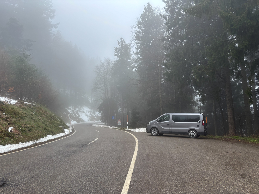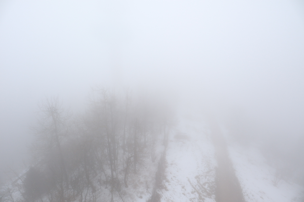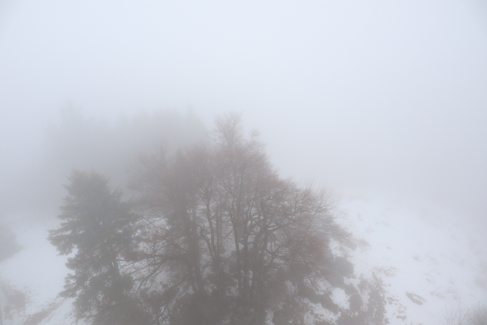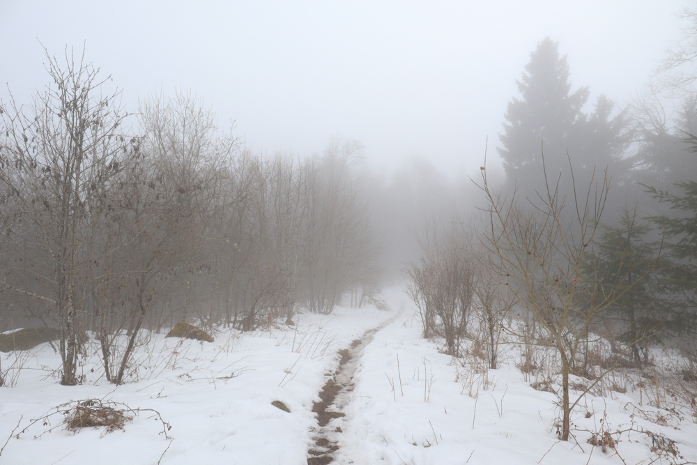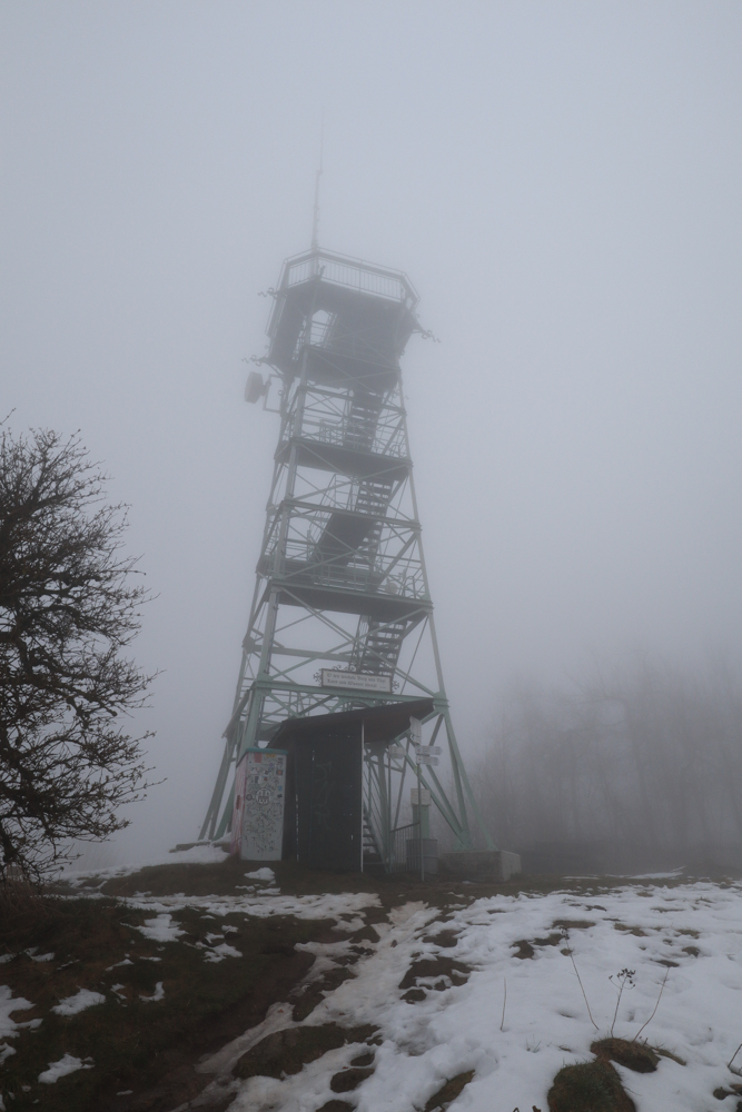 Dann komme ich am Turm an. Wie erwartete gibt es nichts zu sehen. Unendliches Weiß in der Ferne. Schaue in die Richtung der Vogesen. Aus der Richtung, aus der ich vorhin kam. Zwischenzeitlich so schönes Wetter und jetzt wieder alles voller Nebel und Schnee. Vielleicht ist auf den „Berg“ gehen doch nicht immer eine gute Idee. Doch. Es lohnt sich immer. Rausgehen. Immunsystem stärken.